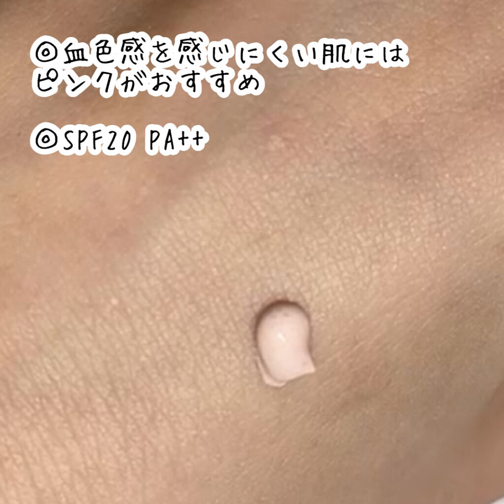 特徴- 素肌に足りない光を補い、透明感を高める化粧下地- 光コントロールと凹凸補正などで、内側から輝くような、なめらかな肌へ格上げ- 青・黄・赤の光がバランスよく反射することで、透明感を放つ肌- 血色感を感じにくい肌には、ピンクがおすすめ- SPF20 PA++ 使い方指先に適量(パール粒1コ分程度)とり、顔全体にのばす 感想お試しサイズでもらったアイテムだけど、伸びと仕上がりの色が良すぎて本品買おうとおもいます✨