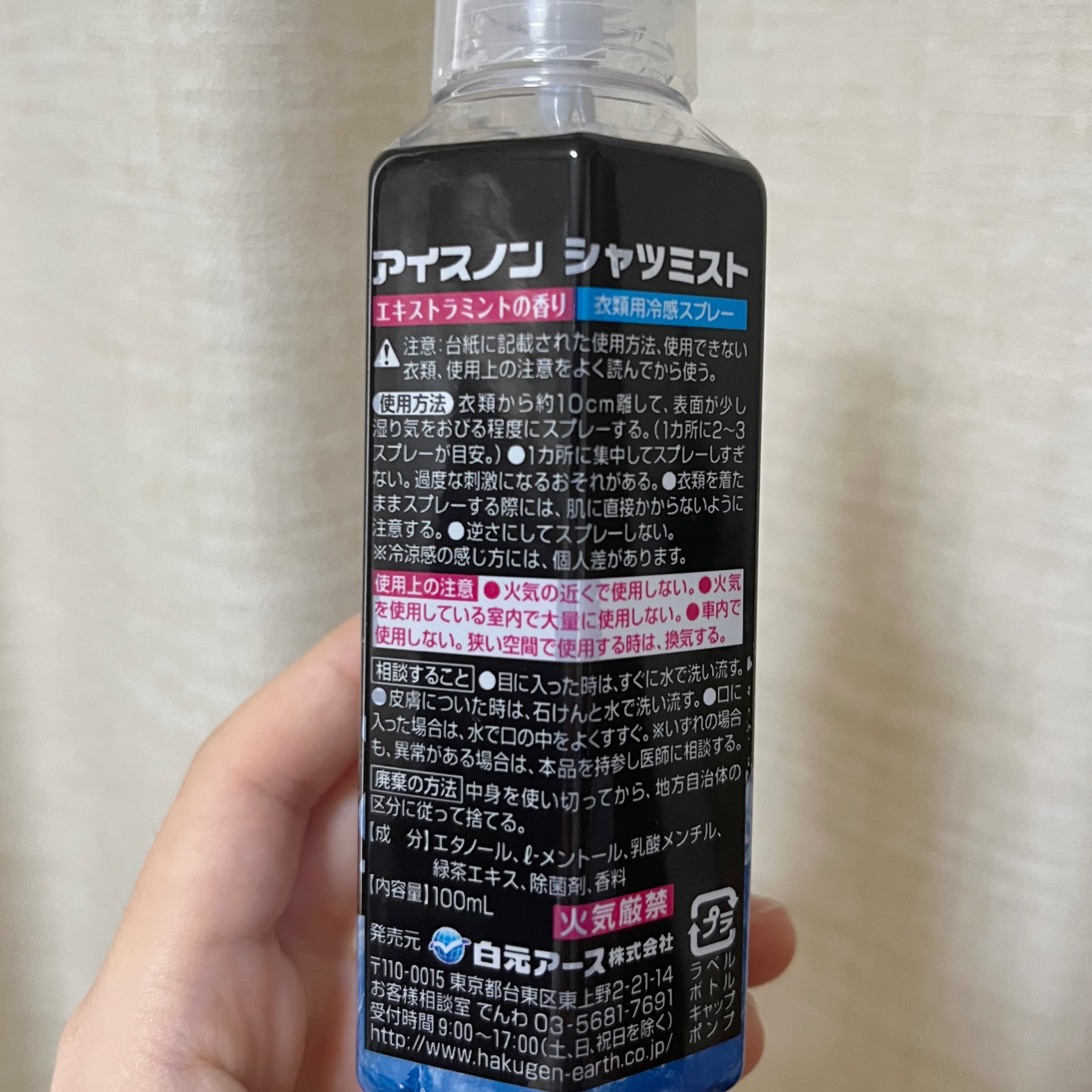 アイスノンシャツミストエキストラミントの香り100ml⚪︎ドラッグストア購入⚪︎北海道でも暑すぎる⚪︎かけた瞬間は冷たい!けど持続はしない⚪︎汗かいたときに清涼感を感じると口コミを見て(実はパケ裏にも書いてあった)確認してみたけどあまり感じない...
