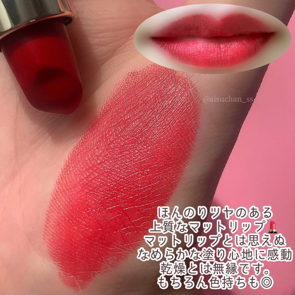 まず見た目がゴージャス💎 高級感溢れるパケに加え、 リップのカットが まるで花びらのように美しい。 使い心地も抜群です。 普通のリップとはひと味違う リッチでなめらかな塗り心地に感動🥺 マットもびっくりするくらい スルスル塗れちゃう。 うるおい感も抜群で、乾燥とは無縁です。 まるで花が咲いたかのように 鮮やかな発色なのに、 ちゃんと肌に馴染むのが本当に不思議。 普段赤リップを使うと 顔から浮きがちな私ですが、 これは全然大丈夫だった。 少しお値段は張るものの、 納得のクオリティ。 自分へのご褒美にぴったりのリップです。 1本持っていて間違いなし。