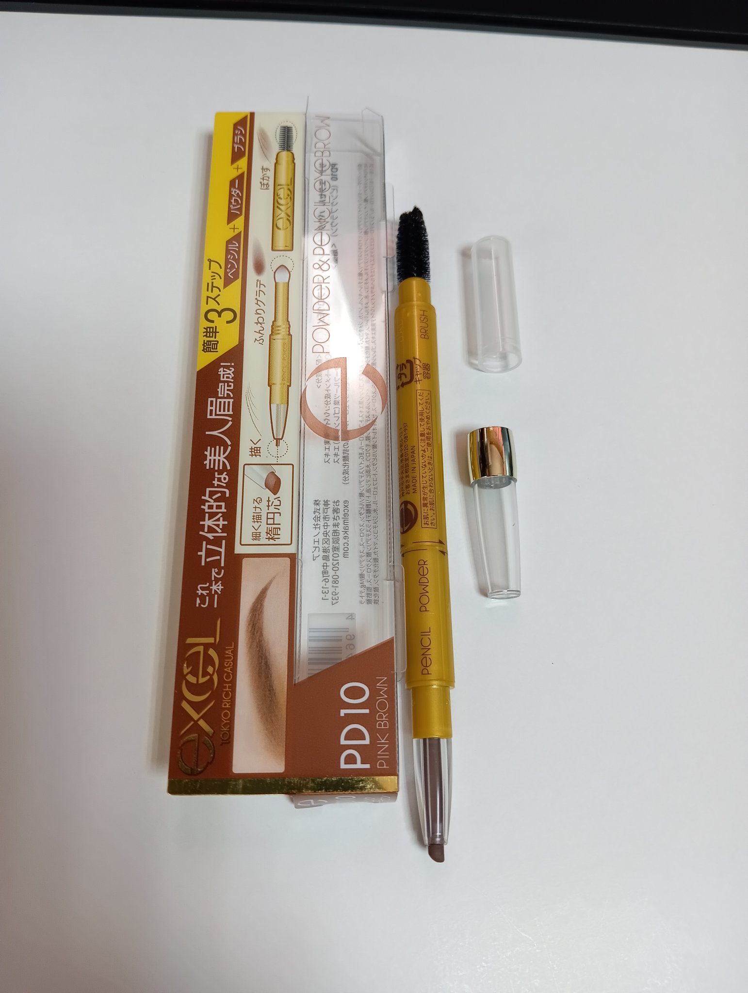 ✔excel✔パウダー&ペンシル アイブロウEX✔PD10✔ピンクブラウン♡描きやすいペンシルとパール感のあるふんわりパウダーで、ぼかしの効いた美人眉が簡単に描けるアイブロウ♡🍓ペンシル、パウダー、ブラシの3つの機能を兼ね備えて、これ1本で簡単にアイブロウメイクができる<3つの機能>☆ペンシル機能隙間埋めや目尻の細かい部分、太いラインも描きやすい楕円芯のペンシル。☆パウダー機能濃淡がつけやすく、フィット感の高いチップタイプのパウダー。☆ブラシ機能毛流れを整えたり、全体の色をぼかすために使うやわらかタッチの立体スクリューブラシ。🍓誰でも簡単に美人眉を描ける便利さや、豊富なカラー展開から幅広い年齢から愛されているアイブロウ[こんな方にオススメ]🍓ふんわりした仕上がりの眉が好みの方🍓アイブロウメイクが苦手な方や初心者の方🍓ヘアカラーを頻繁に変える方🍓ポーチの中をすっきりさせたい方♡なりたい印象やファッションに合わせて選べる8色のカラー展開♡PD01ナチュラルブラウン:自然なブラウンヘアにPD02キャメルブラウン:明るめ自然なブラウンヘアにPD05グレイッシュブラウン:暗めブラウン系~黒髪にPD07モカブラウン:モカ系の赤みブラウンヘアにPD08ハニーブラウン:ゴールド系の明るめブラウンヘアにPD10ピンクブラウン:ピンク系のブラウンヘアにPD11アプリコットブラウン:キャメル系・オレンジ系ブラウンヘアにPD13アッシュグレイ:グレイ系~アッシュ系ヘアにご参考までに(^^)今までいろーんなアイブロウアイテム使ってきましたが、アイブロウはexcelが一番好き♡粉質がしっとりしてて、まじでふんわり仕上がり♡アイブロウは意外と落ちやすい箇所で特に夏場なんか;お直しように持ち歩くにしてもケースよりもさらにコンパクトに持ち歩けるから1本あれば重宝します!