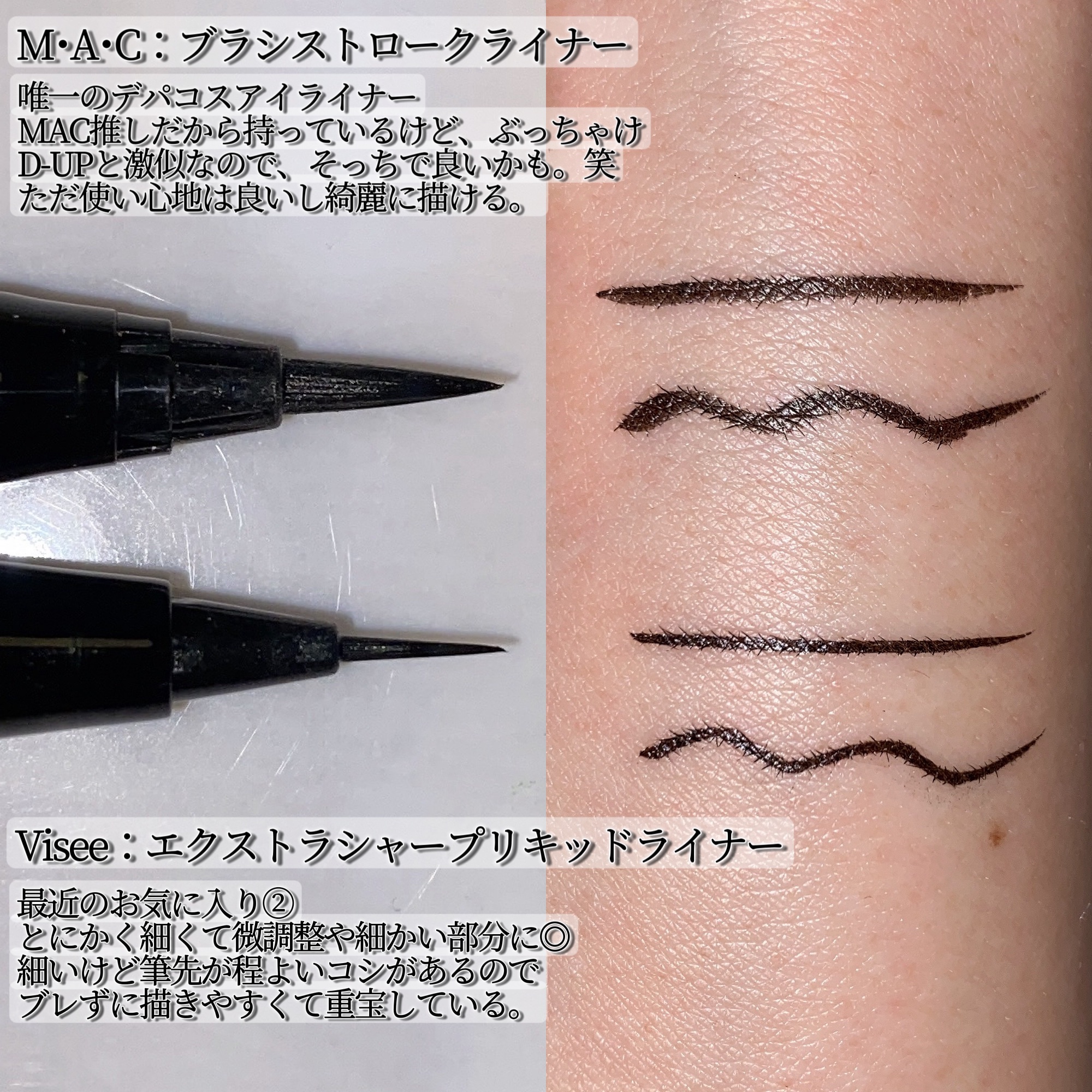 わたしのお気に入りアイライナーまとめ❤️❤️全てリキッドアイライナーです❣️いつもメイクによって、どう使いたいかで使い分けしています🥰基本的に全てに共通するのが・カラーはブラック一択!!!・ウォータープルーフ(スマッジプルーフも込み)この2点は共通となります❣️わたしの場合、元々アイライナーは何を使っても滲んだり落ちてしまう事が無いので(目元の形や涙の量によるのでしょうか)メイクをしてて落ちてしまうという物が無いので、メイクをした時の落ちにくさは検証できていません🙏🏼💦画像にざっくりとまとめて文字入れしていますが、こちらにも書いておきます____✍🏻⋆┈┈┈┈┈┈┈┈┈┈┈┈┈┈┈⋆UZUBYFLOWFUSHI【EYEOPENINGLINER】ブラック筆先が柔らかいけどコシがあり描きやすい◎細い線や、まつ毛の生え際に沿ってラインを引くにも重宝します!ハネも描きやすく、程よいコシが自然と強弱を付けてくれる感覚。初心者さんにもオススメ◎⋆┈┈┈┈┈┈┈┈┈┈┈┈┈┈┈⋆LUMIURGLAS【スキルレスライナー】01.パーフェクトブラックハネをシャープに描きたいわたしにはやや物足りない。筆先が柔らかいので、全体的にはとても描きやすい◎優しめラインや、ハネラインは必要ない方にはオススメ◎力が入ってしまう方にはブレやすいかも。⋆┈┈┈┈┈┈┈┈┈┈┈┈┈┈┈⋆D-UP【シルキーリキッドアイライナーWP】BK漆黒ブラックとてもバランスの良いアイライナーで使いやすい◎筆先の程よい硬さ、コシがあるのでシャープにも引きやすいし強弱も付けやすいので、まっすぐ引くにもカーブを付けるにも優秀◎幅広い方にオススメ◎⋆┈┈┈┈┈┈┈┈┈┈┈┈┈┈┈⋆KATE【スーパーシャープライナーEX4.0】BK-1これは代々使ってきたけど、3.0が好きでした。新しい4.0はカートリッジの付け替えなど便利さが増した部分はあるけど、前より筆先が柔らかく感じるし、少し滲むのでシワに入りやすい。描きやすさはあるので、目元にシワがない方や、柔らかい描き心地が好きな方は試してみてほしい◎⋆┈┈┈┈┈┈┈┈┈┈┈┈┈┈┈⋆ヒロインメイク【スムースリキッドアイライナースーパーキープ】01漆黒ブラックこちらはXでアイラインがめちゃくちゃ上手なFFさんが推していたアイライナー。さすがに使いやすくて最近のお気に入りナンバーワンです!筆先の硬さ、コシが絶妙で、シャープなラインが好きな方にはゴリ押ししたいくらいオススメ◎逆に、なだらかな柔らかいラインが好きな方には硬く感じてしまうかも。⋆┈┈┈┈┈┈┈┈┈┈┈┈┈┈┈⋆ヒロインメイク【プライムリキッドアイライナーリッチキープ】01漆黒ブラック上のアイライナーの強化版といった、より落ちにくい処方らしいアイライナー。こちらを先に持っていた。笑使い心地はほぼ同じだけど、落ちにくさの分なのか少しインクが重たく感じる。そのためやや、もたつく感じがあり細かい作業には不向きな印象。使い心地はほぼ同じなので落ちにくさ重視ならこちら◎⋆┈┈┈┈┈┈┈┈┈┈┈┈┈┈┈⋆M・A・C【ブラシストロークライナー】ブラシブラックこれは、MACオタクなので持っていますが、ここまでお金を出さなくても良いかな。笑D-UPのアイライナーと使い心地が似ていて、筆の硬さやコシのバランスが良いから使いやすさはバッチリ!ラインも綺麗に引けます。ただ高いので、これじゃなきゃ!とはならない。MACオタクなのでわたしは買います。笑⋆┈┈┈┈┈┈┈┈┈┈┈┈┈┈┈⋆Visée【エクストラシャープリキッドライナー】BK001ブラック最近のお気に入りナンバーツー!他と比べても一目瞭然の筆先の細さ!これが、細いのに筆先がふにゃふにゃする事もなくしっかりとしたコシがあるブラシで使いやすい!細かい部分や微調整、わずかな修正にも役立つし、シンプルに細いアイラインが引きたい方にもオススメです◎⋆┈┈┈┈┈┈┈┈┈┈┈┈┈┈┈⋆わたしの好みはシャープなハネが描ける、漆黒ブラックのリキッドアイライナーなので、このような感想となっております!!シャープなラインが引きたい、リキッドアイライナーをどれにするか迷っているという方は良バランス→UZU、D-UP、シャープさ→ヒロインメイク、繊細さ→Viseeがオススメです🥰店頭で試し書きできるものが多いので、是非チェックしてみてください❤️❤️#アイメイク#アイライナー#リキッドアイライナー#アイライン#アイライナーリキッド#アイライナー_落ちない#UZU#uzu_アイライナー#ヒロインメイク#ヒロインメイク_アイライナー#KATE#kate_アイライナー#d-up#d-up_アイライナー#MAC#MAC_アイライナー#visee#visee_アイライナー#LUMIURGLAS#スキルレスライナー