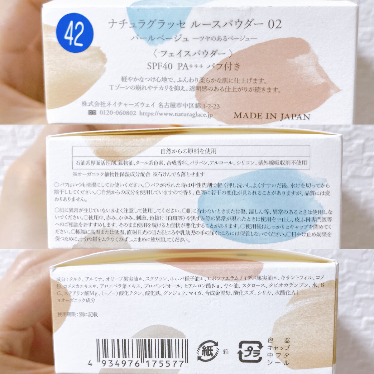 ナチュラグラッセ ルースパウダー 02パールベージュ レビューおすすめの方🌼◎肌に優しいパウダーを探している人◎石鹸落ちの化粧品を探している人◎保湿力のあるパウダーが欲しい人✏️レビュー簡単まとめベージュの多機能パウダーです!紫外線、ブルーライトカット、石鹸落ちで肌に優しい使い心地です。マット寄りではありますが、程よくツヤも残る仕上がりです。また、保湿力のあるパウダーなので、テカリや毛穴の気になる人には向いていません😅肌トラブルが少なく、肌に優しい化粧品が好きな人に向いていると感じました!-------------------------------------------🔍詳しく知りたい方用 レビュー詳細↓商品:ナチュラグラッセ ルースパウダー 02パールベージュ ¥4,620税込(公式サイトより)✅特徴①SPF40PA+++/ブルーライトカット/石鹸オフOKです。②肌の水分・油分のバランスを快適な状態に保つことで化粧崩れを防止。保湿効果も。③Tゾーンの崩れやテカリを抑え、透明感のある仕上がりをキープします。⭕良い点①パウダーは石鹸でオフでき、肌に優しい仕様なのが◎付属のパフも厚みがありふわふわで、肌当たりが良かったです。②紫外線カットとブルーライトカットの両方ができるのも嬉しいです!③仕上がりはマットでさらさらになりますが、保湿力のあるパウダーなので乾燥は感じませんでした。程よくツヤを残してくれる仕上がりです。❌悪い点①肌がテカりやすい人には向いていないと感じました。塗った直後はサラサラですが、保湿力があるためか皮脂には弱い印象です。②やや厚塗り感がでる仕上がりなのがマイナスです。そのまま付けるのではなく、パフに粉をよく揉み込んで使ったほうが良いと思います!③コンパクトサイズではないので持ち運びには向いていません。このパウダーは毛穴やテカリが気になる私にはあまり合いませんでした😅いいお値段だったので残念です、、ナチュラグラッセは多機能で、肌に優しい使い心地なのが嬉しいですね!気になった方はチェックしてみてくださいね🤗#ナチュラグラッセ#ガチレビュー