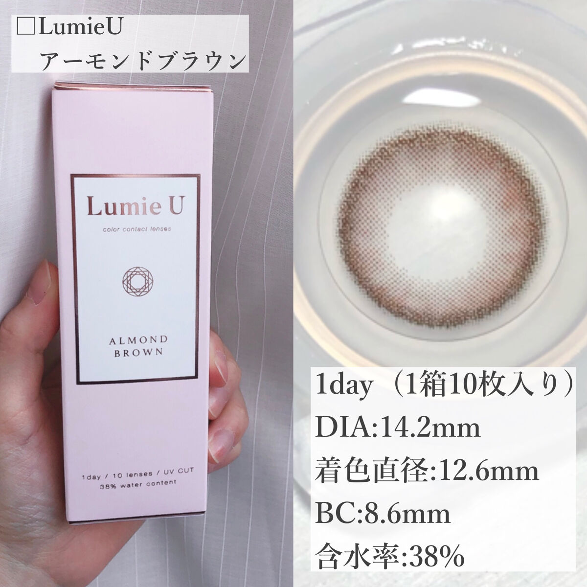 \大人のナチュラルカラコン/LumieU…❤︎…………………………………………………□LumieU1day アーモンドブラウン1day(1箱10枚入り)DIA:14.2mm着色直径:12.6mmBC:8.6mm含水率:38%…………………………………………………温かみのあるアーモンドカラーと瞳の輪郭を綺麗に見せる細フチデザインの組み合わせ🤍このLumieUシリーズは瞳本来の美しさを引き立てる裸眼風レンズ。ナチュラルさにびっくりしました✨着色直径12.6mmと小さめでほんの少し裸眼を大きくしています!細フチデザインでのっぺりとみえず瞳に光が入るような上品なレンズ。みなさんもぜひ買ってみて下さい~!#提供#ルミエユー#カラコン#カラコンレポ#ナチュラルカラコン#ブラウンカラコン#リリーアンナ#lilyanna#リリーアンナ公式アンバサダー