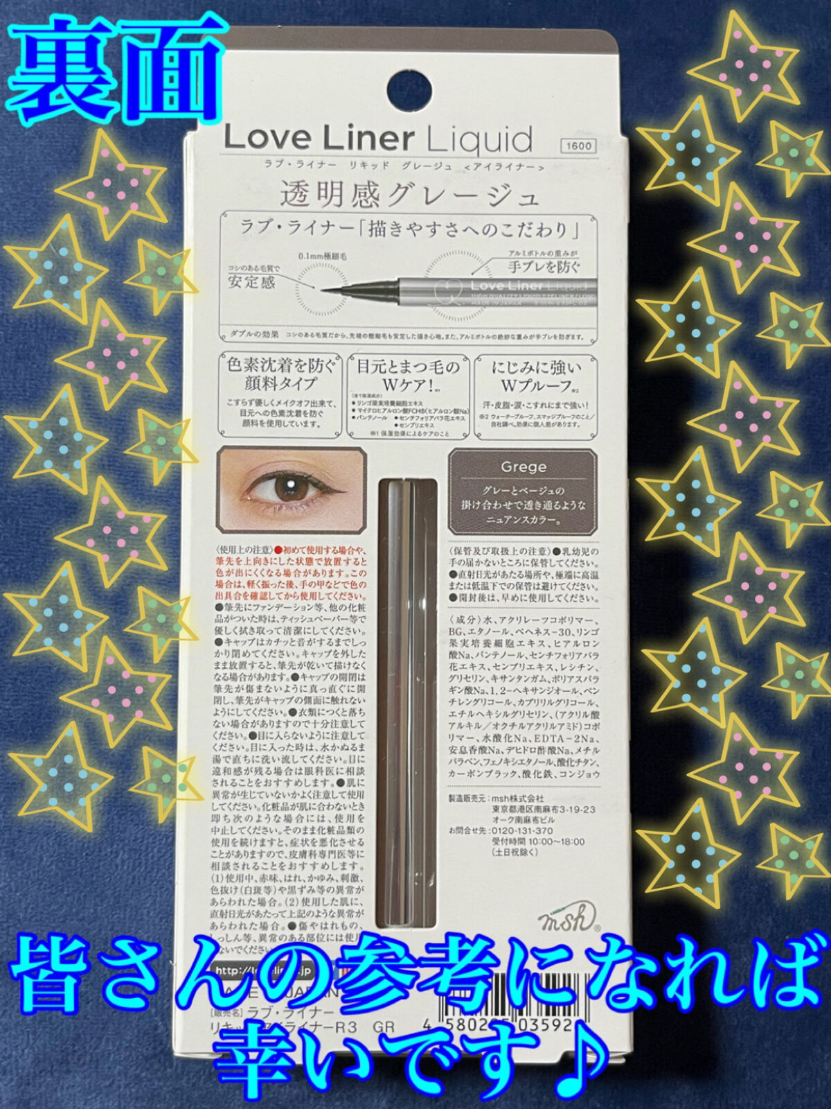 【使った商品】 ラブ・ライナーリキッドアイライナーR3 グレージュ【商品の特徴】銀色のシンプルなデザインが最高にかわいい.....筆先が細くてボールペン並に重さがある(気がする)【使用感】アイラインのひきかた永遠にわかんない.....って泣い...
