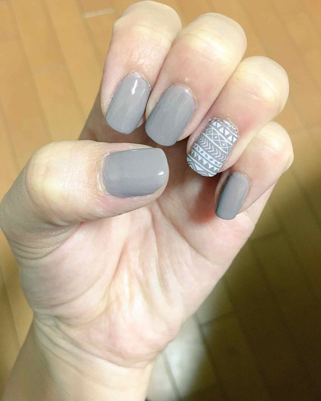 <グレーのスタンプネイル>新し目のこなれ感ネイルが売ってたので買ってしまいましたっちょうどいいスタンプ台もあったので薬指にだけ使用。セリアのスタンプネイルはシリコンが透明なのですごく使いやすいです...