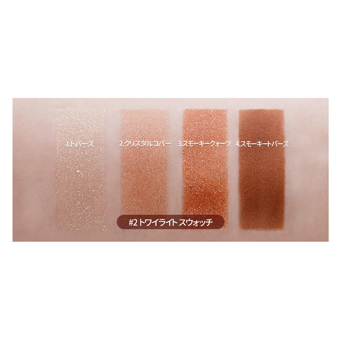 発色も密着感もグリッター感も最高だった💕 ブラウンのニュアンスが少しずつ違う4色が詰まってて捨て色がないのがさすが😍 ラメ感がとってもキレイだし、角度を変えるとキラキラ感も変わってとってもキレイ❣️ 粉っぽさもないし、よれたりせず肌への密着感も◎ これで2,090円(税込)はかなり嬉しい❣️