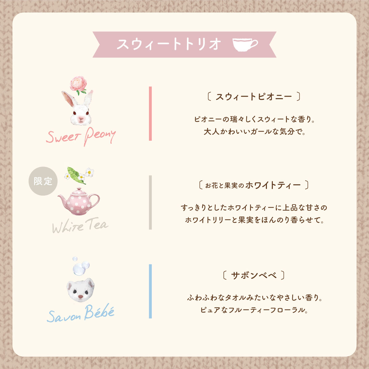 フルーティーさを感じる限定のホワイトティーの香りのハンドクリームが含まれているのも購入のきっかけでした。 このホワイトティーの香りが女性らしく甘いのに後に引きずらないさらっとした印象の香りなので使いやすくて気に入りました。 ミニサイズ3種セットなのでプレゼントにも喜ばれそうな商品だと思います。