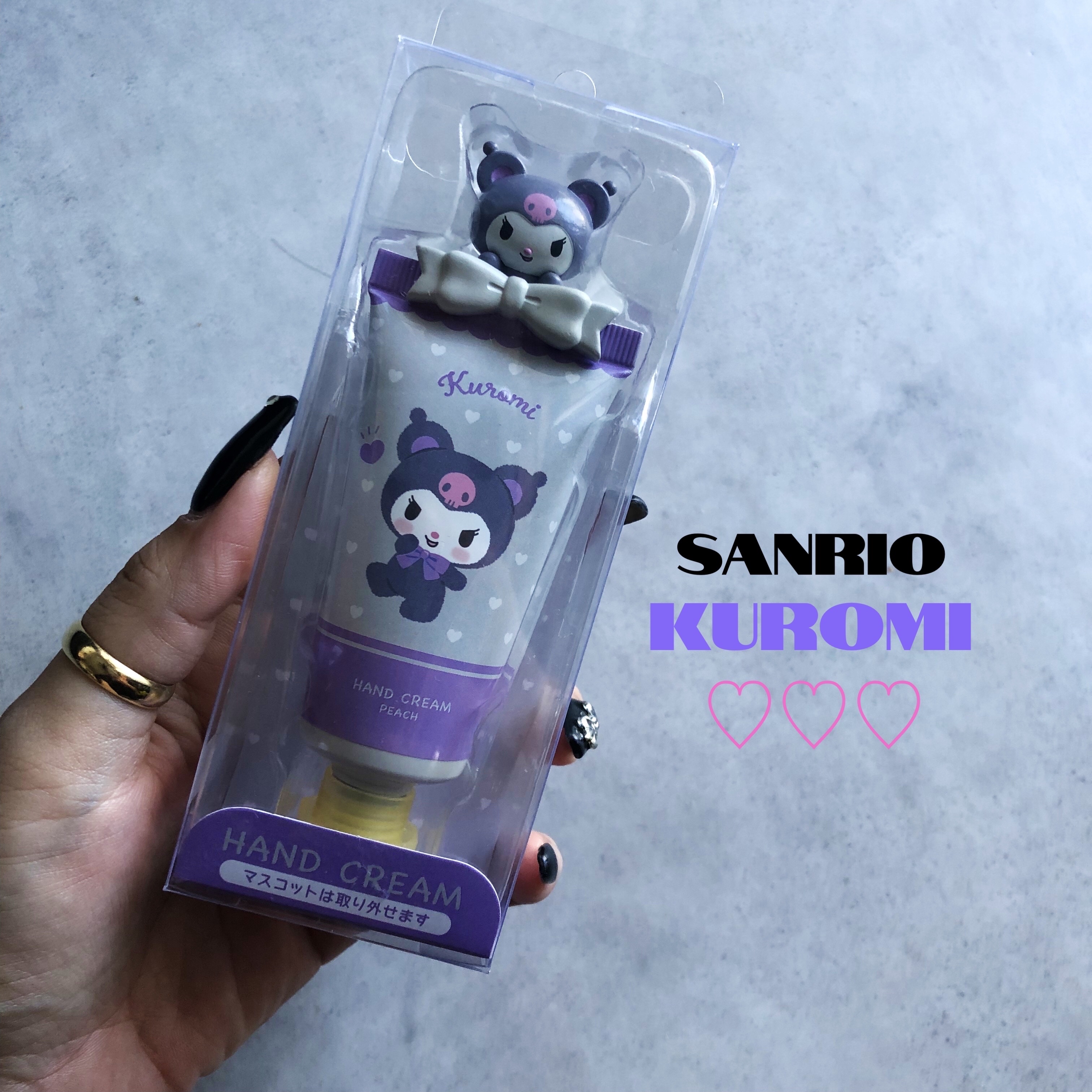 サンリオSAラブハンドクリーム KUコンビニで見つけちゃいました!えー💕かわいいいいいっ!!!ピーチの香りで甘い感じ〜!伸びも良くてベタベタしないのでめちゃくちゃ良き🫶なんといっても、パッケージが可愛いいっ!!クロミちゃん👿🖤#サンリオ#クロ...