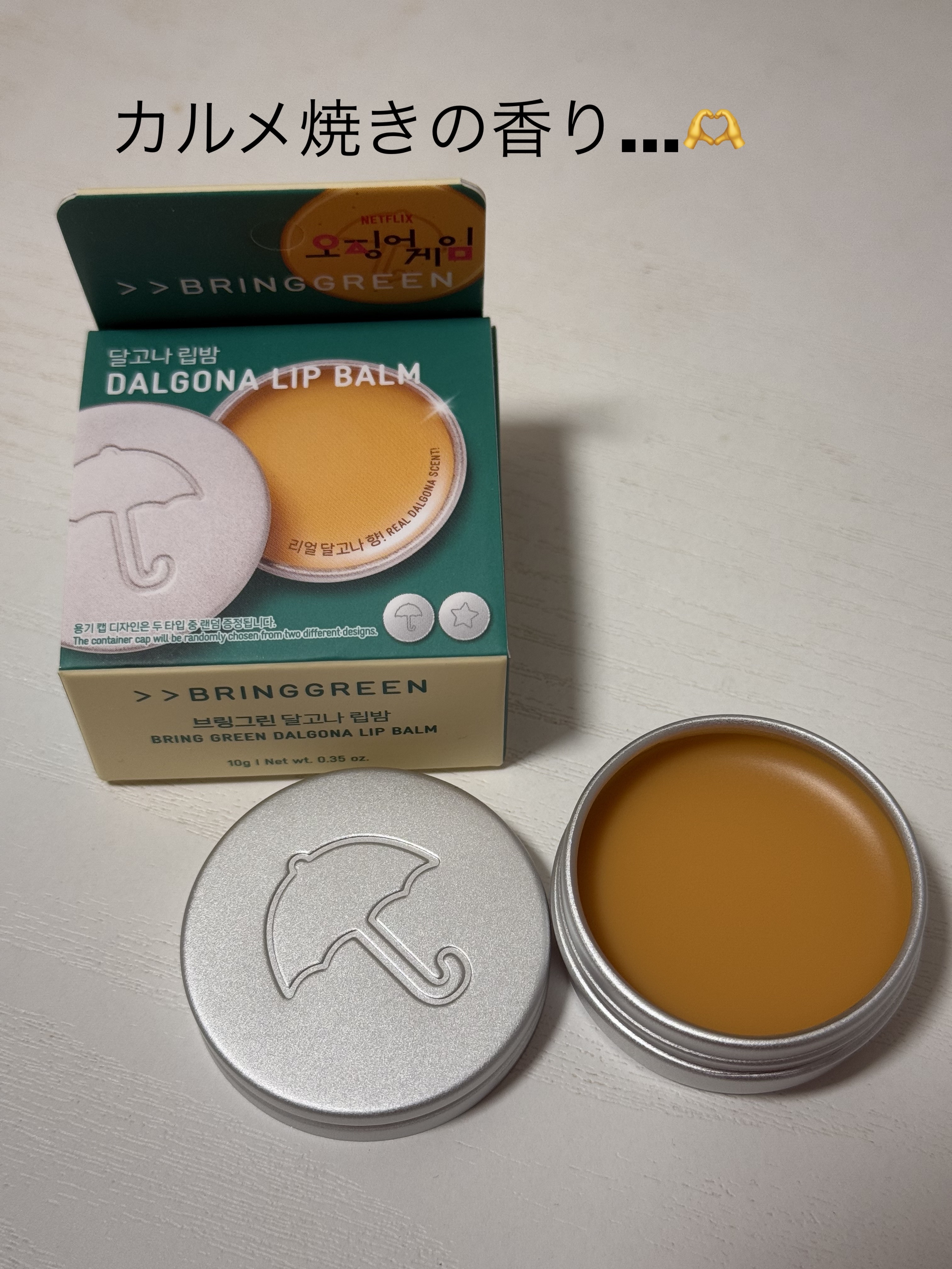 BRING GREENとイカゲームのコラボコスメ。パケもシーズン1に出てくる型取りするやつ。 テスター試したらお砂糖の甘い香りがして見た目じゃなくて使用感でも遊び心がある。 シュガースクラブも入ってて角質ケアもできるリップバームで最高。