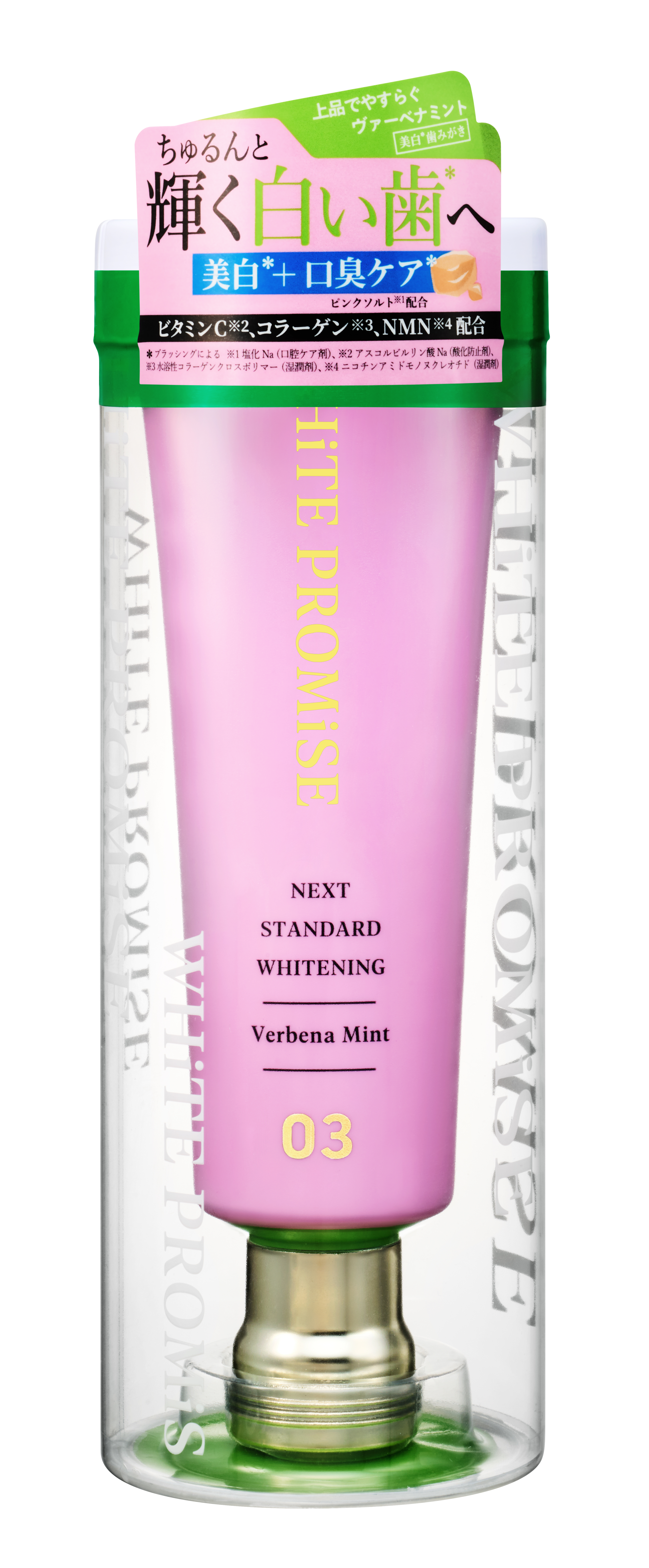 WHiTEPROMiSE「ヨーグルトミント」「ヴァーベナミント」✨美容液発想の美白*歯みがき✨これまでのオーラルケアに無い「美容液発想」で美容液成分や先進成分としても注目のビタミンC*1、コラーゲン*2、NMN*3を組みわせた美白*美容液成分...